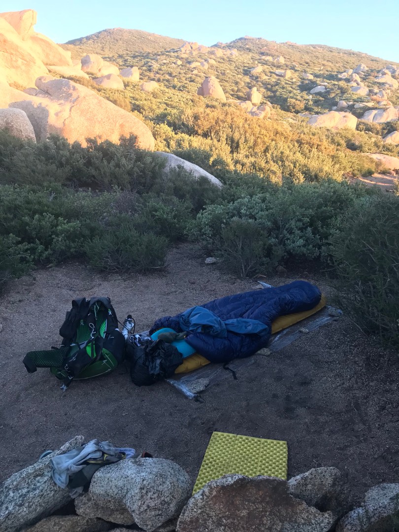 It wasn’t just me that made this mistake, quite a few did. Most are pushing ahead the extra 7 miles to the next water but my feet just don’t have it in them. I pulled up stumps at mile 56 to cowboy camp amongst some boulders. If I’m conservative and get an early start in the morning I’ll make it to the the next water fairly early on. It’s on a road, so if it’s dry, I can always hitch into the town of Julian.