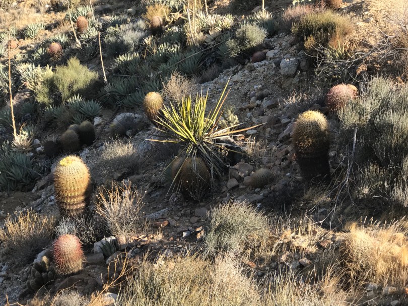 Right through the morning the trail led up.  A gradual climb, contouring around the side of a range, but always up. This was your classic desert picture with 3 or 4 different types of cacti within every view, sparse and low vegetation. Here and there scattered stunted Juniper bushes filled the air with their sweat aroma.