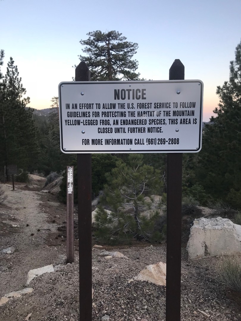First thing this morning I had to detour around a closed section of the PCT. It’s closed for an endangered species of frog. While the trail in this section is situated up high and I’m assuming the frog lives in the gully lines, there are a couple of creeks that I guess are fairly important for the frog that the Parks Service don’t want a bunch of hikers taking water from or more importantly not washing in.