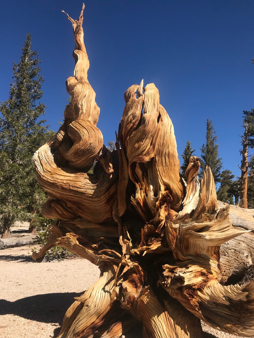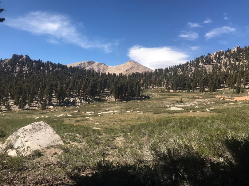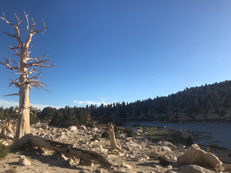 The terrain flattened but continued to climb on a low incline through forest like I’ve never seen before. Trees stand straight and tall with tessellated, rust coloured bark, looking like pipe cleaners with the bright green needles forming tufts along their length. They float over a sea of decomposing granite rock and boulders. The is an absolute lack of an understory, so much so that if it wasn’t for the slope and boulders you could play a game of Aussie Rules underneath.