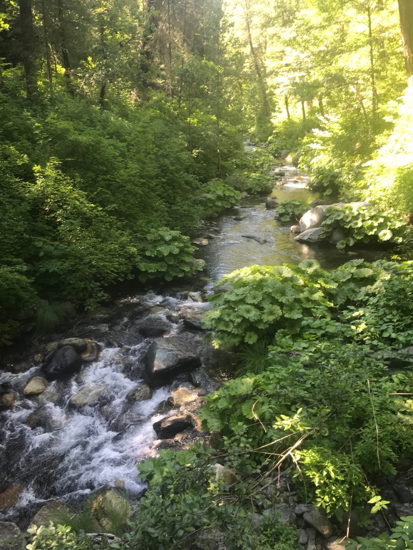 I hit the trail to the rising sun peaking over the mountain horizon on the opposite side of the valley. Walking through tall pines decorated in the brightest moss their whole length, sunlight broken by the canopy and casting dappled light on the trail in front. A nice way to start the day.