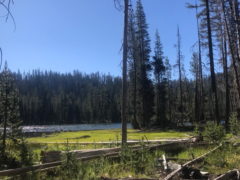 Most of the morning was walking through burn area. Hundreds of acres of burnt trees, zero canopy and standing sticks waiting to fall down. Many standing with what looks like blackened glass. The charcoal sheen must have something to do with the resins in the pines. Photos probably don’t do it justice.