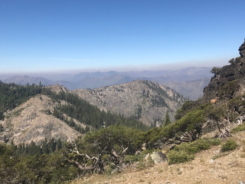 And like most of Northern California once at the top of a climb, the trail heads straight back down and up another mountain. The PCT roller coaster. I don’t mind this too much as it makes for a more direct line and a lot of the trail ends up on ridge tops. I’m sure the view would be spectacular any other time but not with the smoke haze. Mountain lakes, granite spires and lush valleys all obscured today.