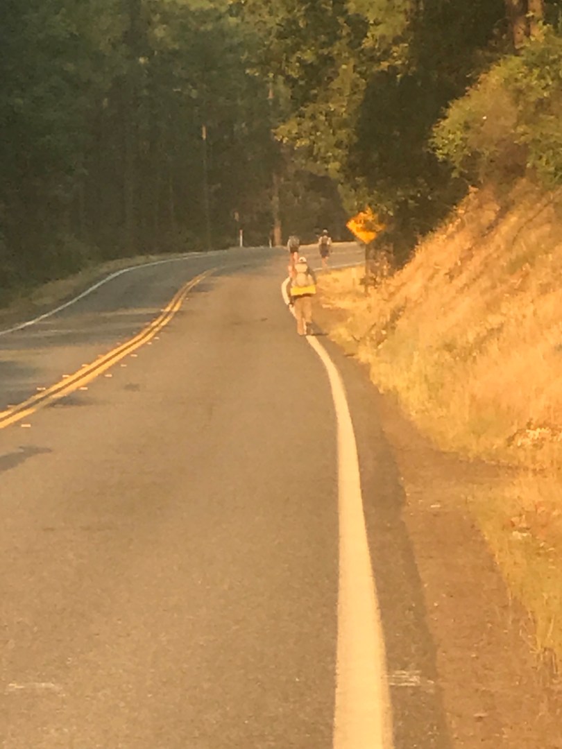A two hour leisurely road walk saw us in to Seiad Valley. Settled low, the fire smoke was super thick. There has just not been any wind or rain to disperse it. The air is hazy and yellow obscuring the flanking ridge lines and visibility is down to about a mile, maybe two.