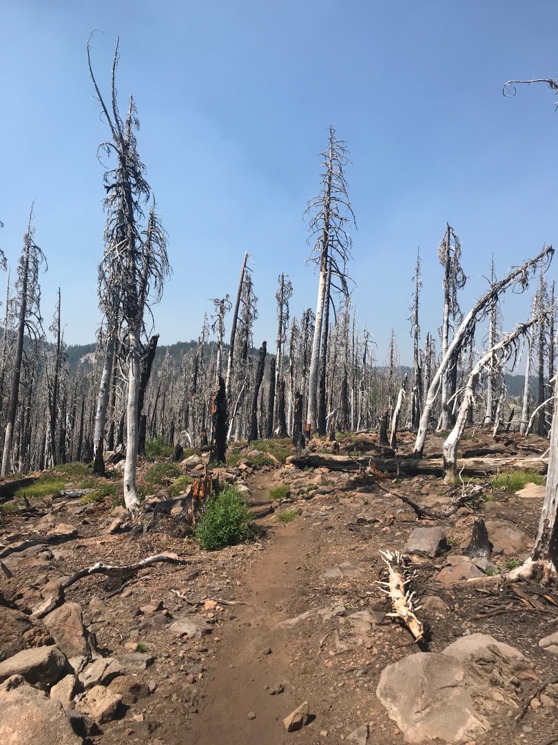 After lunch, entering the Skye Lakes Wilderness the terrain finally changed, becoming slaty rock for many miles and a few hills thrown in to spice things up, hillsides strewn with white rocks around the size of your average TV set.