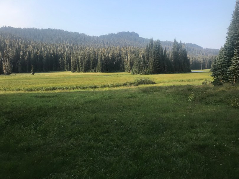 The scenery was unexpected. Beautiful alpine meadows for the most part with semi clear views, fire smoke is still really heavy, and past several mountain lakes. Heading north bound it was mostly down hill.