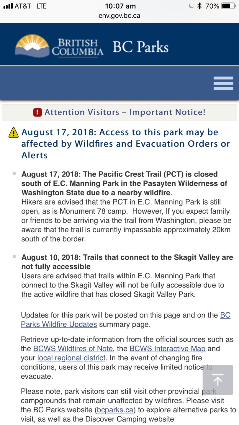 During the day I contacted the Canadian border agency and confirmed that given my permit to enter into Canada was via the PCT and is invalid now that the trail is closed. I can cross a road border on foot at Osoyoos though which is what I plan to do, then hitch to Manning Park and day walk out to the PCT end. It looks like BC is encouraging this by reiterating that the trail is open on the BC side.
