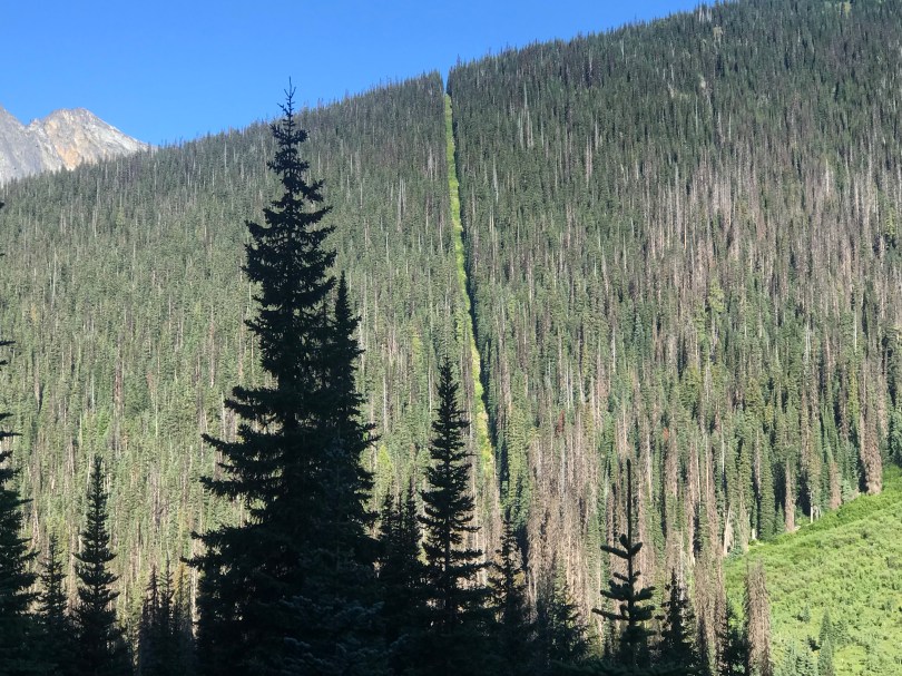Much of the trail was a green corridor through the trees with the odd glimpse of the mountains on the Canadian side. Quite a few wind blown trees across the trail as well.