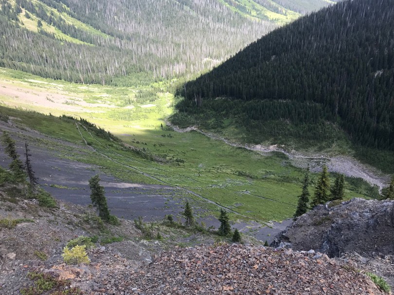 From the top of Rock Pass the whole next section of trail could be seen all the way, descending in long windy switchbacks, cutting across a rockfall and the more switchbacks up to Woody Pass.