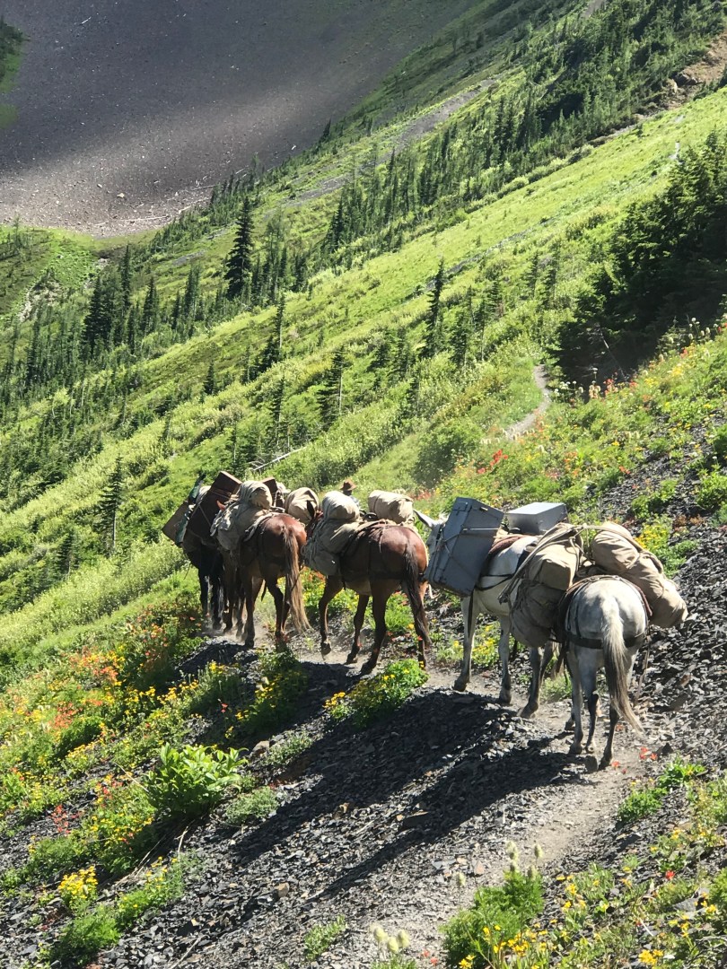 Negotiating the switchbacks down I could see a train of horses headed my way. As they approached I found a spot up slope and sat back to let them pass. Horses have right of way on the trail. 15 in total, the lead bunch were a couple of cowboys with mules in tow, loaded with gear. The second bunch, I’m fairly certain were paying clients being lead on horses by guides. Now that is the way to do the trail.