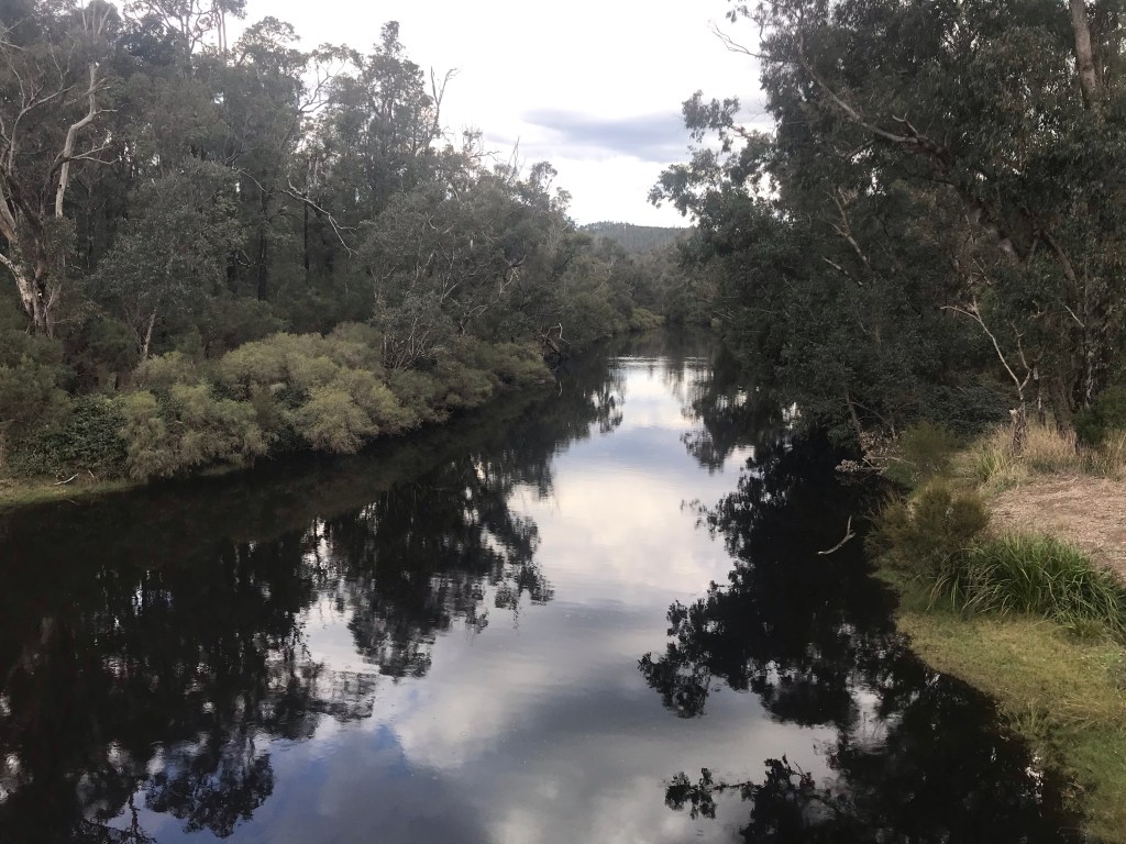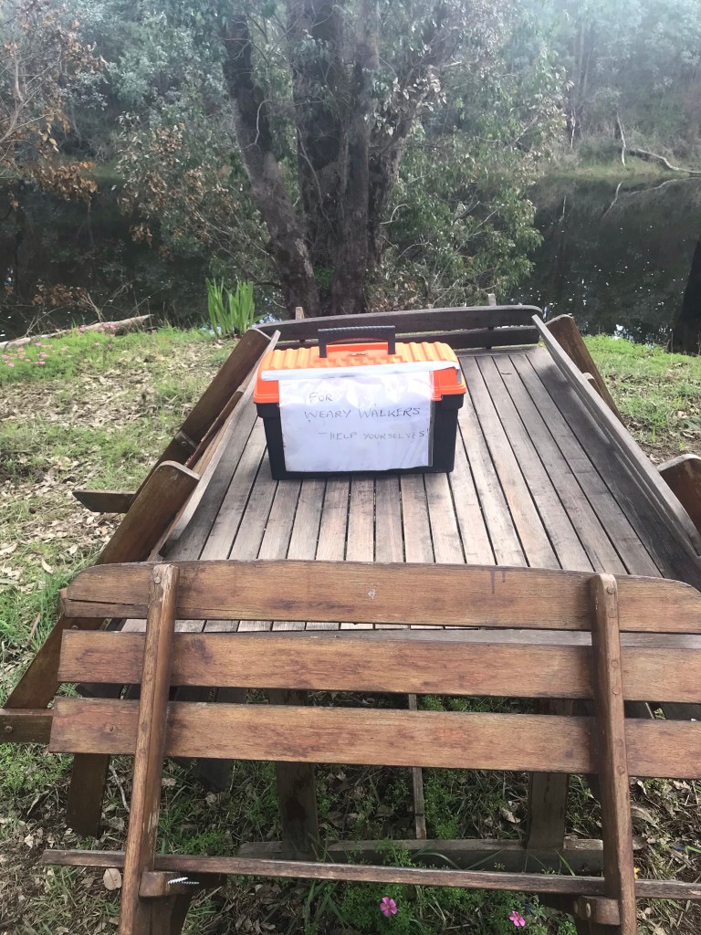 Late in the day, around 35km in and somewhere along the Blackwood River the track entered a section of various private properties. I was exhausted and looking forward to finishing the day out knowing just ahead I had Cardiac Hill to content with. So there was nothing better than finding a picnic table, chairs and box of fresh fruit next to the river with a sign from one of the property owners saying “For weary walkers”. Fantastic. I took the opportunity for a quick break and smashed down a banana, just the thing for tired muscles and to pep me up for the hill.