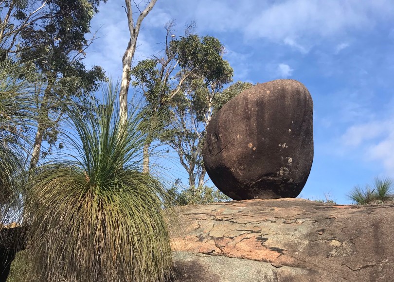 With four kilometers to go for the day the track relented, finally shifting off fire trail and onto single track, climbing steeply upwards to a natural feature – a granite capped hill with views all around. Finally a bit of a challenge, steepish climb on moderatley technical group and the first decent view in weeks.