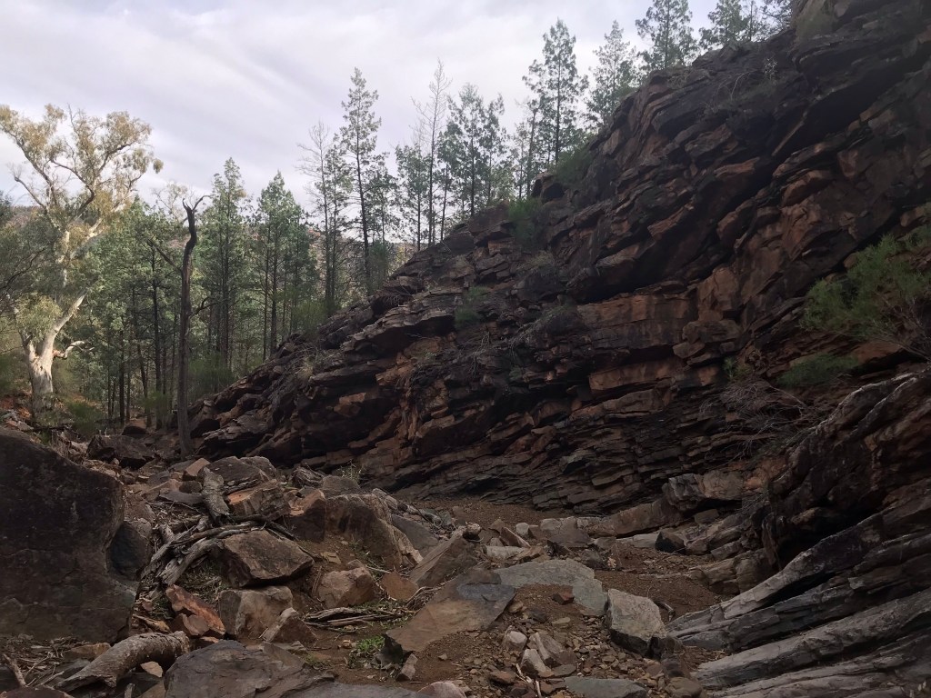 Then it was a steep descent down on rough trail, my kind of trail, back towards more dry creek beds. My feet were paining on the descent, toes smashing into the toe box. I swear this pair of shoes has been mislabelled in the factory. Think I’m going to send them home and back to La Sportiva to see what they say. They are definitely labelled with the same size as I had worn for years. More emphasis to keep pushing into cell service range and get some new shoes sent ahead to Quorn.