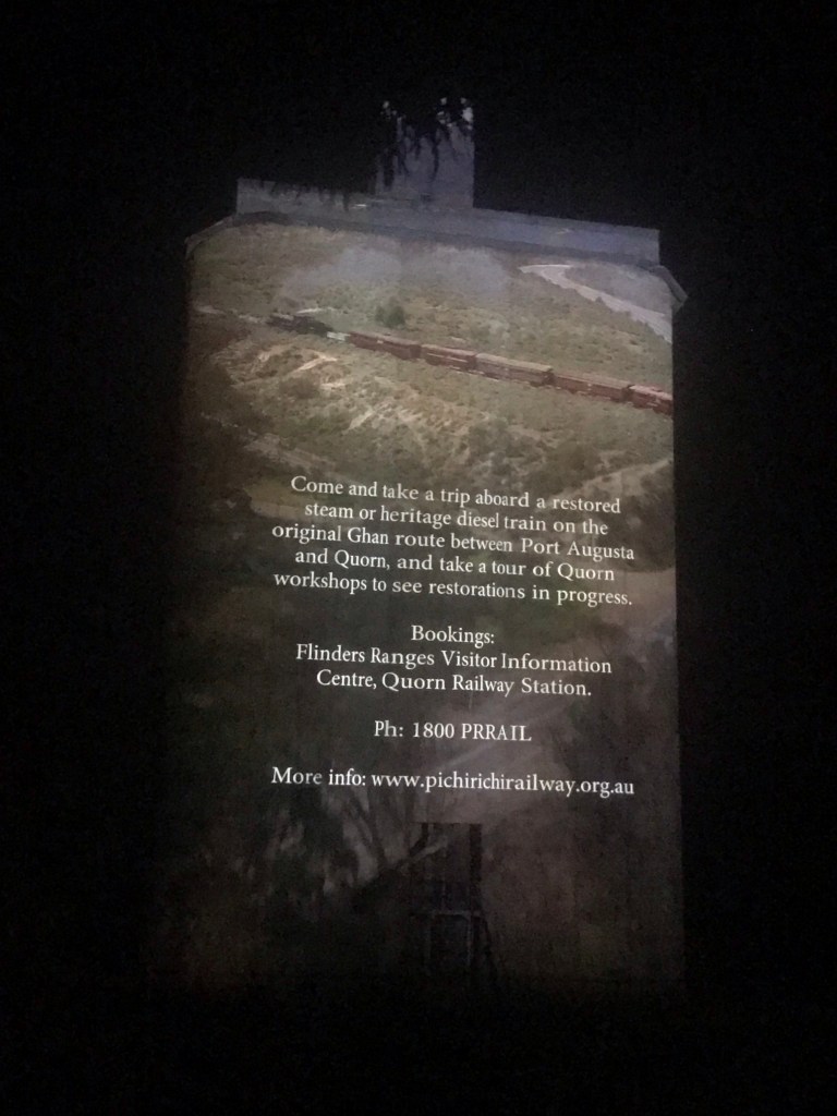 By now it was dark and the a light and story show that airs every night in Quorn was about to start. Shorts films on the local history of the area are projected onto a set of nearby Silo’s making for a huge screen. Stories that I caught included indigenous history and the secret life of water; the importance of the railway network connecting Quorn to the rest of the country in a bygone era and of the CWA feeding troop trains as they came through town in the 2nd world war. It was a great show and popular based on attendance of about 20 others