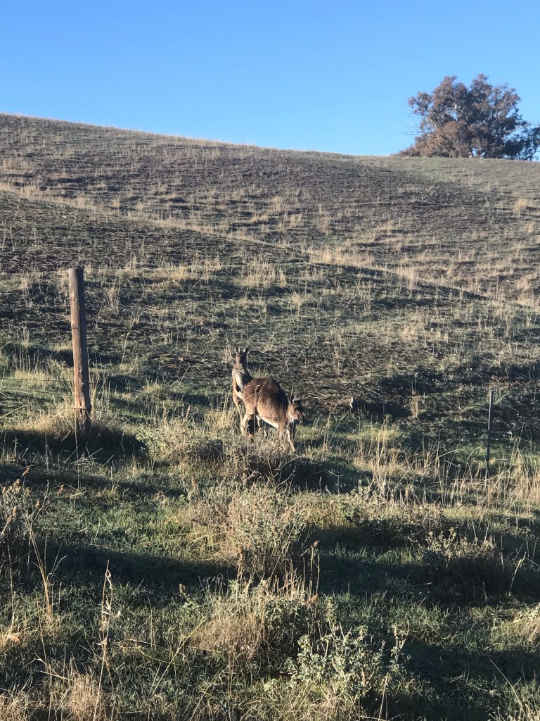 I follow the ridge line for a short while, picking through large boulders and start the descent through thick wattle groves, squeezing my pack between branches in places. Soon enough the Heysen breaks out of the trees into open grasslands. I’m fairly sure this is part of the National Park but can’t tell if these are natural grassed areas or reclaimed farmland. Huge mobs of roos up to 20 strong sun themselves in the morning light until they notice my presence and all but the dominant males fleeing. The large males just stay put, alert and keeping an watchful eye on me but remain where they are without a care in the world.