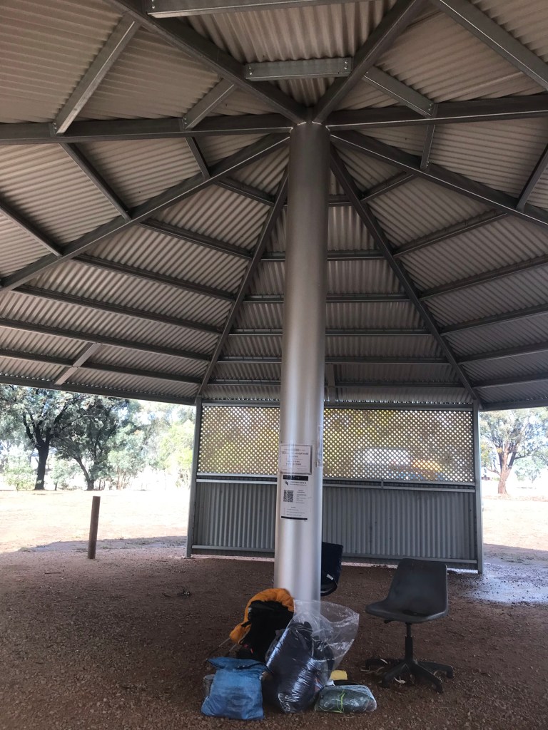 Shortly after writing this Bruce and Isabel whom I met briefing in my way into Quorn showed up having come from the south. They are out section hiking their last little piece of the Heysen Trail. We were chatting away when the Treasurer of the caravan park was walking past and pointed out the three sided camp kitchen and said we could camp under. An awesome upgrade with hot water, showers, power points and an electric kettle. We all quickly relocated and settled in for the evening sheltered from the winds.