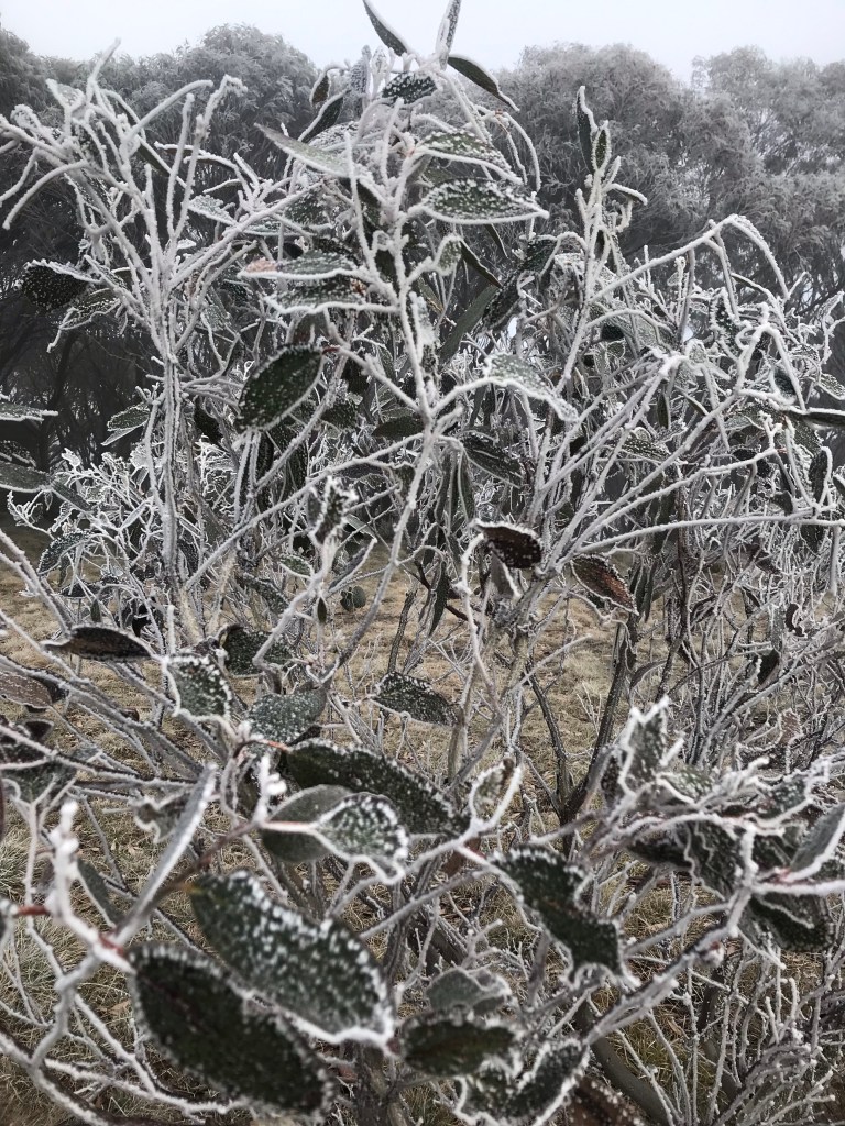 Sure enough it was another snowy night. Not as bad as the last night just enough for a light powdering up high in the snow gums and light sprinkling frozen on the ground.being frozen there was no need for plastic bags in shoes this morning and be descending to lower elevation fairly quickly.