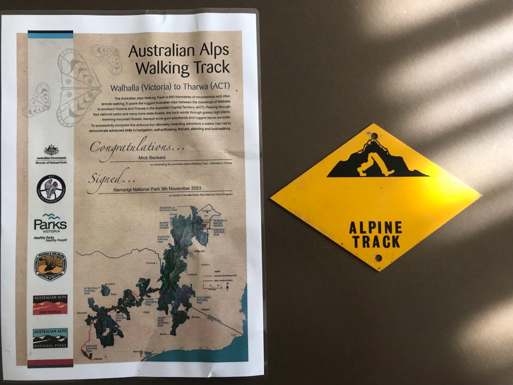Taking my time on the steps with slow and deliberate foot placements and using my poles to take as much pressure off the knee jolts as possible. I made it to the bottom. The ground finally flattened out and I strolled towards the Namadgi Visitors Centre, finding the last (or first depending on direction) trail marker and taking a selfie. I was done! I had successfully completed a long held desire to hike the entire 680km length.
