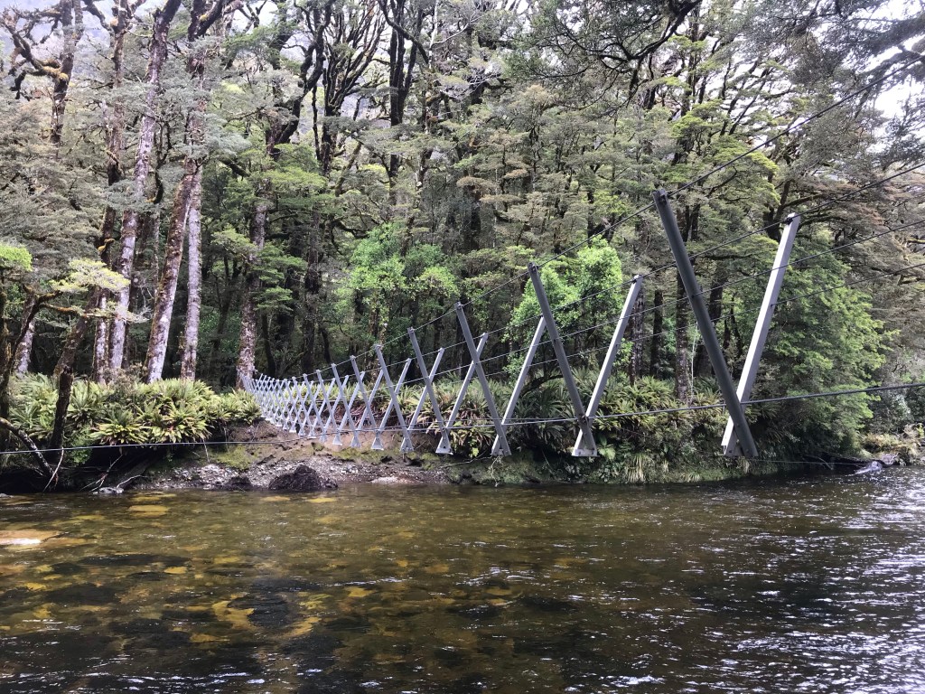 Other than the odd reroute of trail markers to divert the track around major obstacles like land slips and the occasional window cut into large tree blow downs to provide some sort of step up and over, there is little track maintenance carried out along the route. Most maintenance time is spent on keeping huts serviceable and three wire bridges in tact. Across the length of the full Dusky there are 21 walk-wire bridges suspected high above the rivers they cross, often requiring climbing a ladder to then delicately balance out onto the wires. Quite the challenge with a pack on. With so much rain annually, it is not unusual for some of the lower suspended bridges to be completely wiped out during flood events; or sections of river to rise across the track surface cutting access off. Fiordland receives around 7,000 mm of rain annually. I was prepared for the possibility of being stranded and having to wait for water levels to drop by carrying an extra two days food.