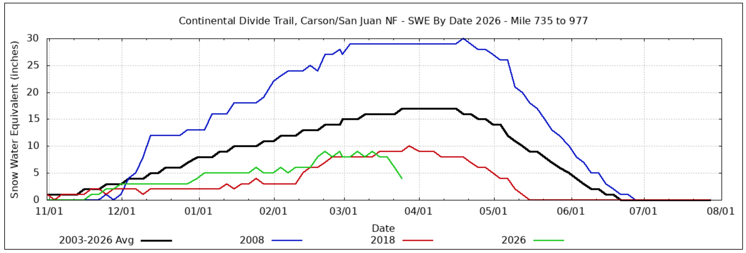 In a typical year there is no need to through rush New Mexico as snow levels in Colorado can still be high. Push too quickly and you have to hold up in town for the snow to melt for several weeks. I don’t have the luxury of being able to wait for weeks at a time so opted for a later start to the trail than most of the hiker bubble that typically leaves in mid April. With many kilometres of trail running under the feet over the past 12 months a later start won’t hurt and I’ll be able to push through New Mexico relatively quickly. As a bonus, 2026 has seen near record low snow levels in Colorado and I’m expecting most of that State to be relatively snow free by the time I reach the border.