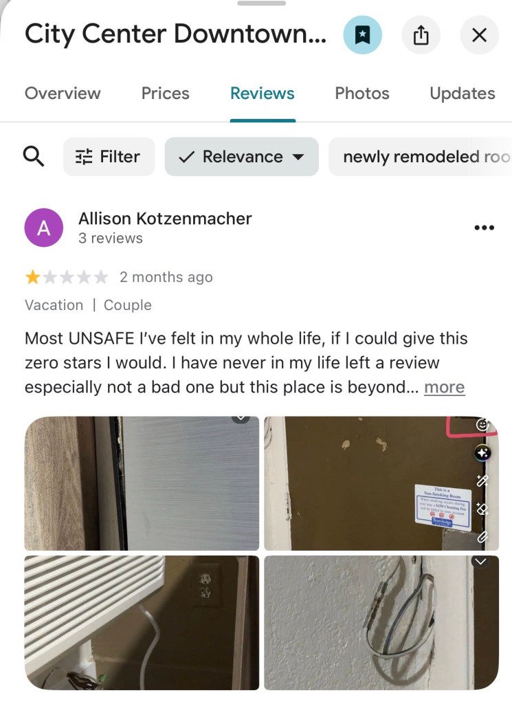 I had to have a second look at some of the online reviews. There was one with photos of a broken door latch, loose wiring on the air con and some other stuff. Interesting the hotel responded to this review stating that none of these issues had been reported and that the review was meant for a different hotel. Some of those photos looked familiar to me. Sure enough they were photos from the exact same room I’m now staying in.